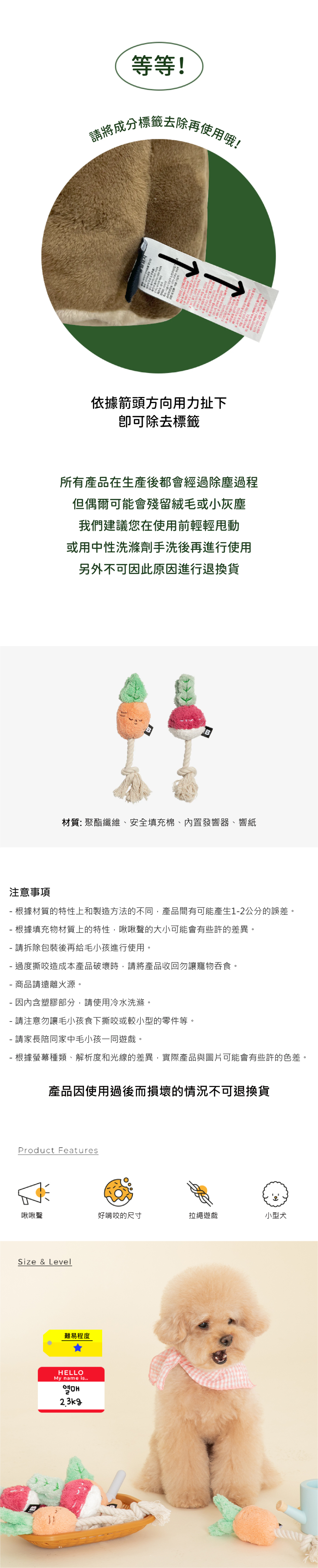 材質:聚酯纖維、安全填充棉、響紙、內置發響器