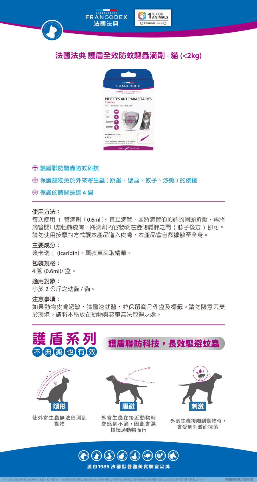 ☑︎ 保護寵物免於外來寄生蟲(跳蚤、壁蝨、蚊子、沙蠅)的侵擾