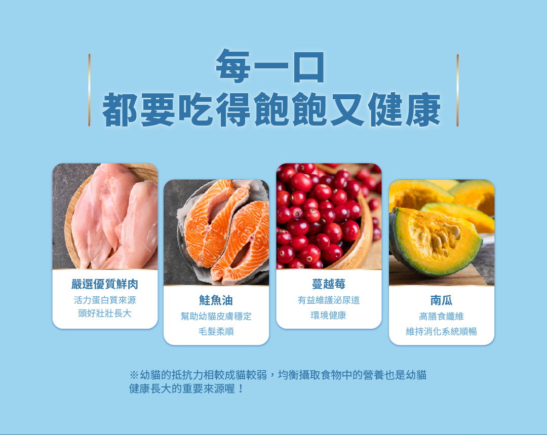 ▸幼貓必需營養素增量,加強補充離胺酸、牛磺酸、鈣質與EPA/DHA