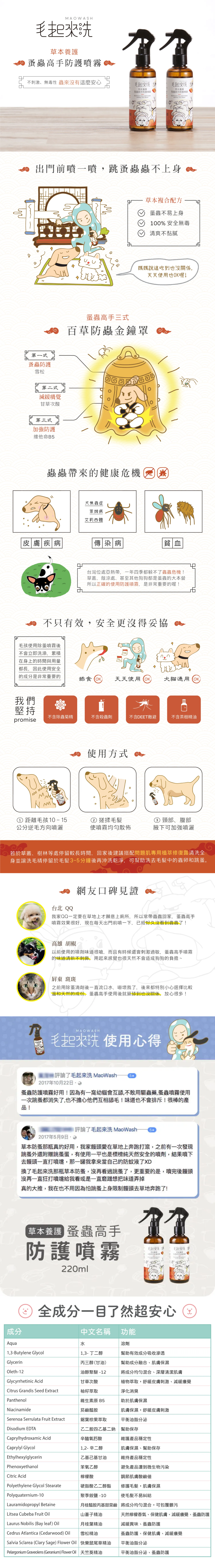 1. 每次出門前,距離毛孩約10-15公分,以逆毛方向噴灑於全身